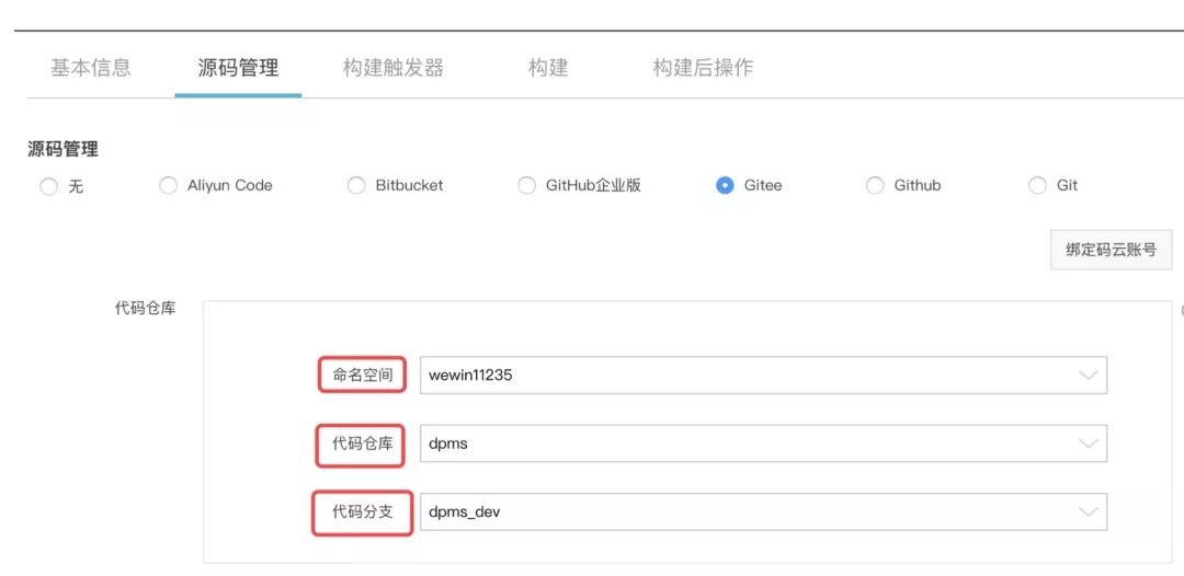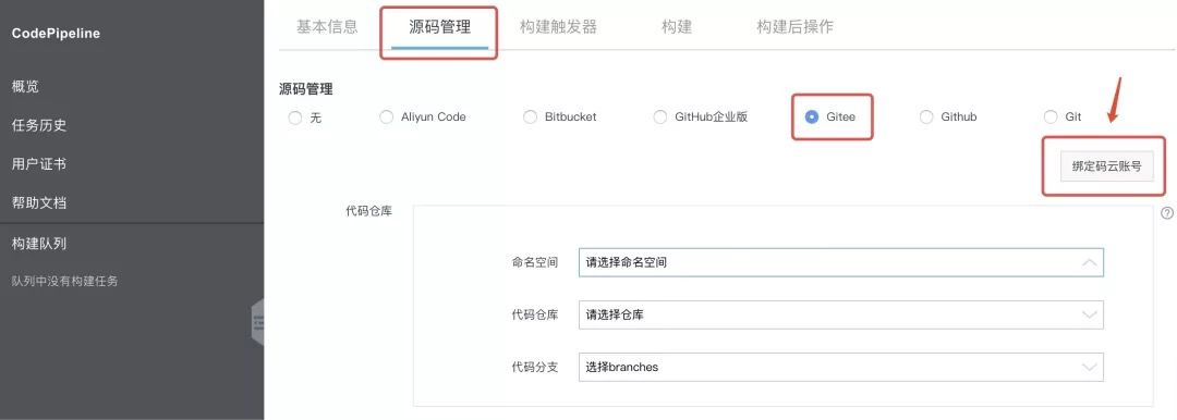 选择 源码管理 -> Gitee -> 绑定码云账号,自动列出您的代码仓库及其对应的分支。