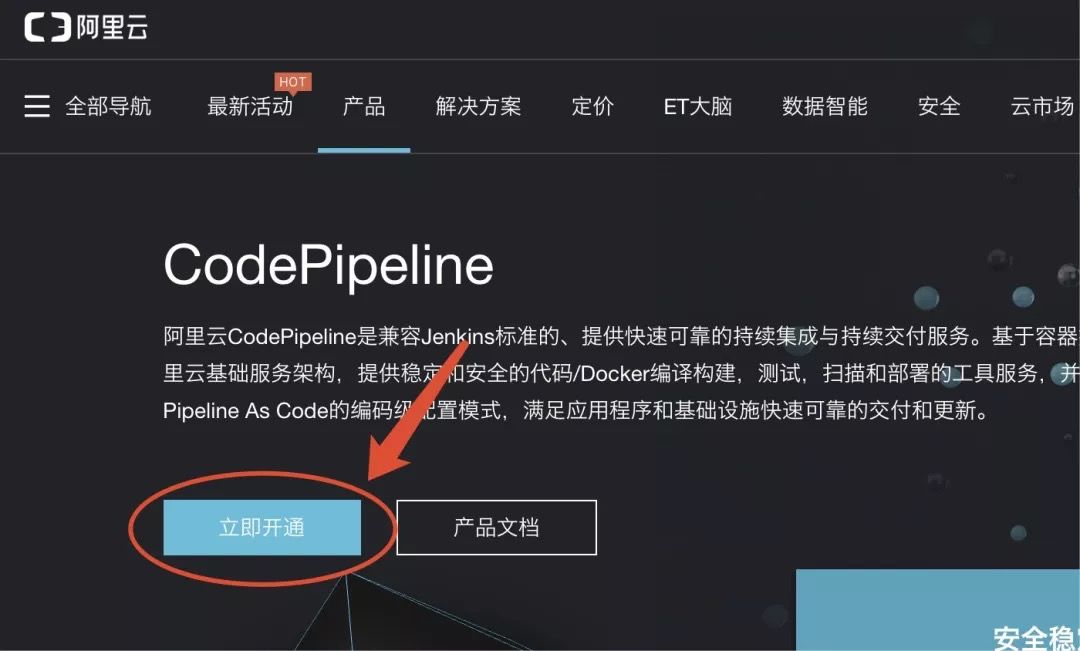 选择 “产品” -> “应用服务” -> “CodePipeline”,点击“立即开通”进入阿里云 CodePipeline 总览界面。