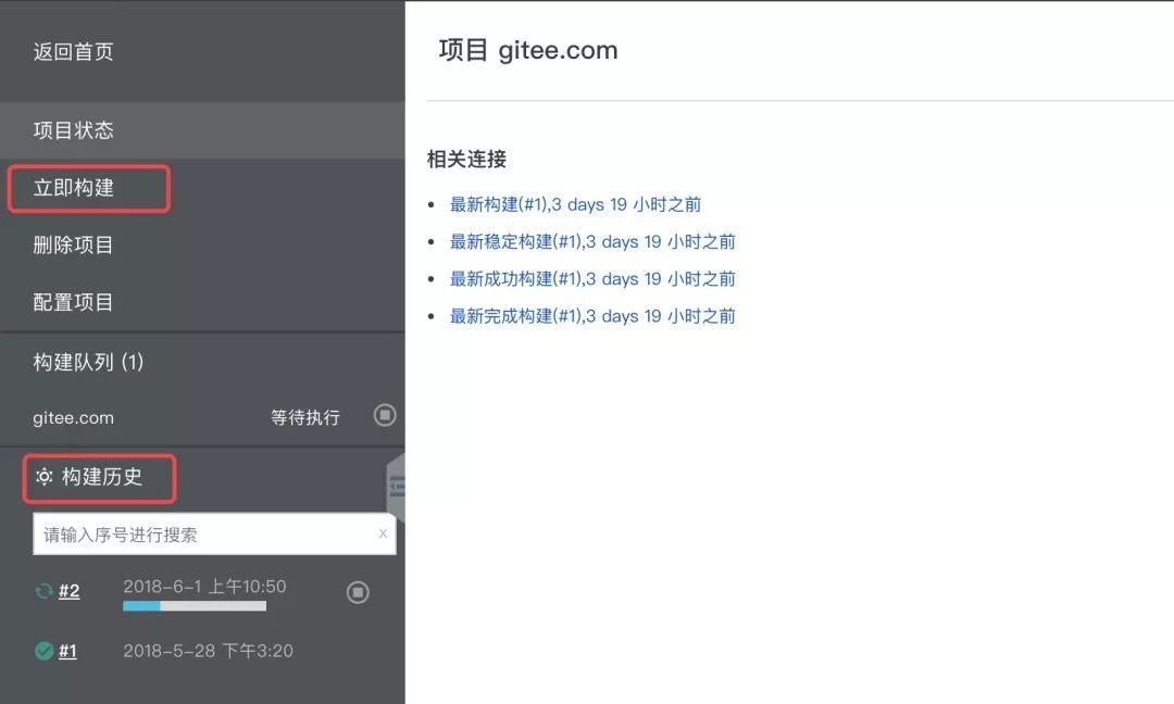构建进度和构建结果可以在构建历史中查看,选择对应构建历史可以查看构建详情。这样就可以很方便对托管在码云上的项目进行持续构建和集成并完成部署工作。