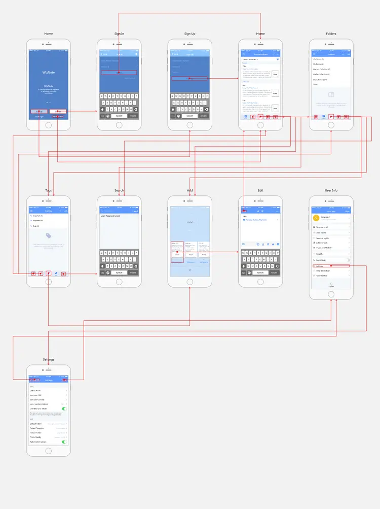 这个原型的主要页面有:登录注册页面、主页、新建页面、搜索页面、个人信息页面等。