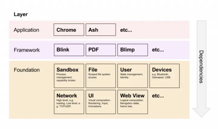 熟悉 Java 的 Spring 的可以明显看出这个依赖倒置。Blink 本来是浏览器最底层的排版引擎,通过 Mojo,Blink 变成了要给中间模块。最近大热的 Flutter 也是基于 Mojo 架构的。