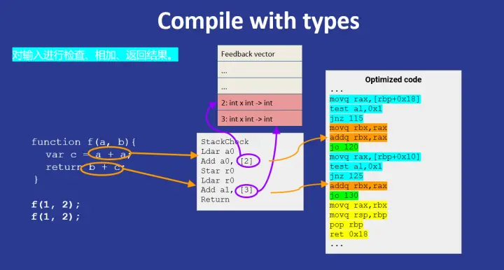 当 V8 执行一个函数时,会基于函数传入的实参(注意是实参,而不是形参,因为 JavaScript 的形参是没有类型的)进行即时编译(JIT):