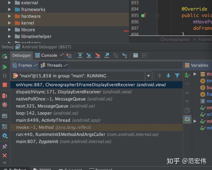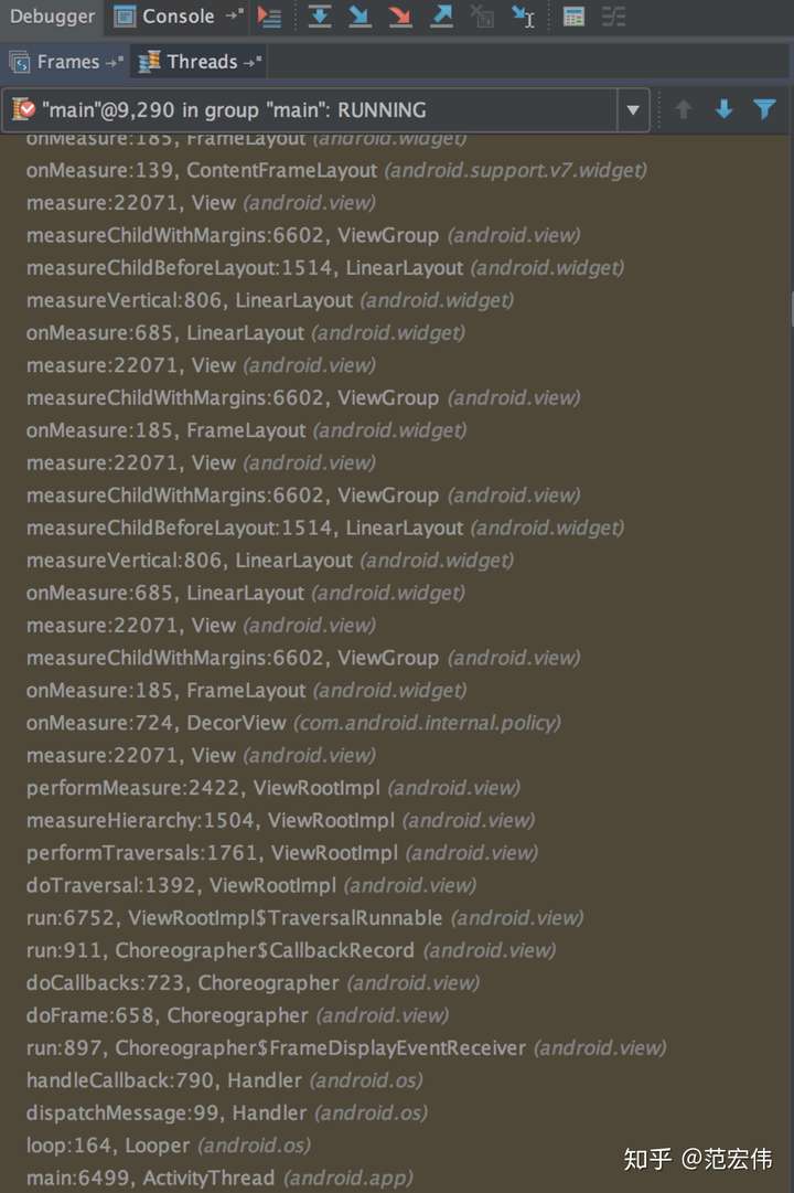 以上是我在一个Android自定义View的onMeasure方法中挂的断点,可以看到是通过MainThread的Lopper发起,MainThread的Handler处理Callback,然后调用到Choreographer,执行一系列的doFrame -> doCallbacks -> doTraversal -> performTraversals -> measureHierarchy。大概了解流程之后,接下来深入Choreographer、ViewRootImpl内部了解。