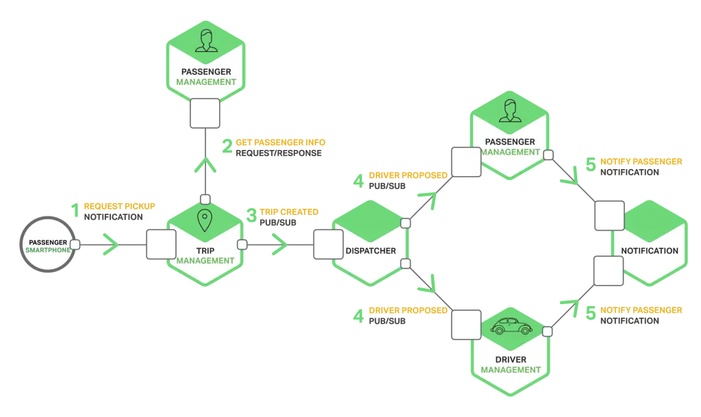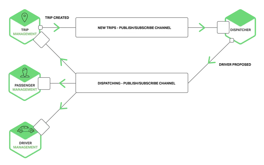 旅行管理服务通过将旅途创建这个消息写到针对旅程创建这个业务的发布订阅通道来通知感兴趣的服务比如调度器。调度器发现可用的司机并通过写入司机推荐这个消息给分发乘客的发布订阅通道的方式来通知其他服务。