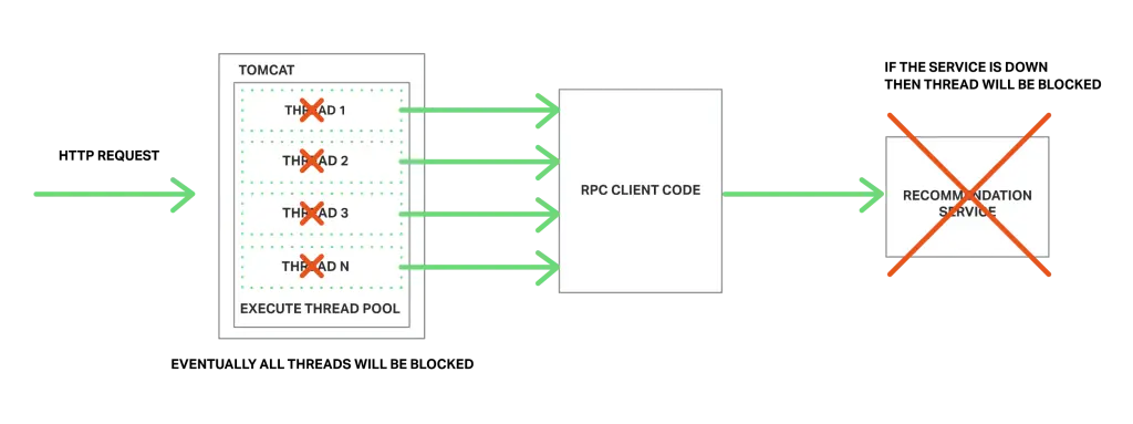 比如,考虑下这篇文章的产品详情方案。我们假设推荐服务没有响应。客户端的垃圾实现可能无限期地等待响应。结果不仅会导致用户体验不好,也会消耗线程这样的宝贵资源。最终运行时会用完线程并变得无法响应,就和下面的图一样。