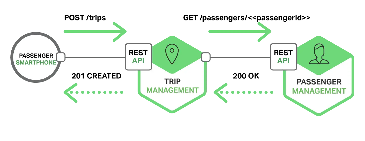 乘客的智能手机通过向旅行管理服务/trips发送POST请求来请求一次旅行。该服务通过发送GET请求给乘客管理服务得到乘客信息。在验证乘客是授权之后再创建旅行。旅行管理服务创建旅行并返回201给智能手机。