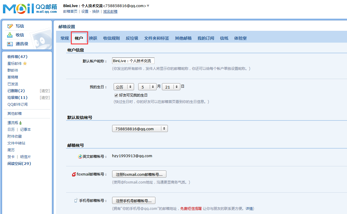 具体请到QQ邮箱中查看,在账户这一项中查看