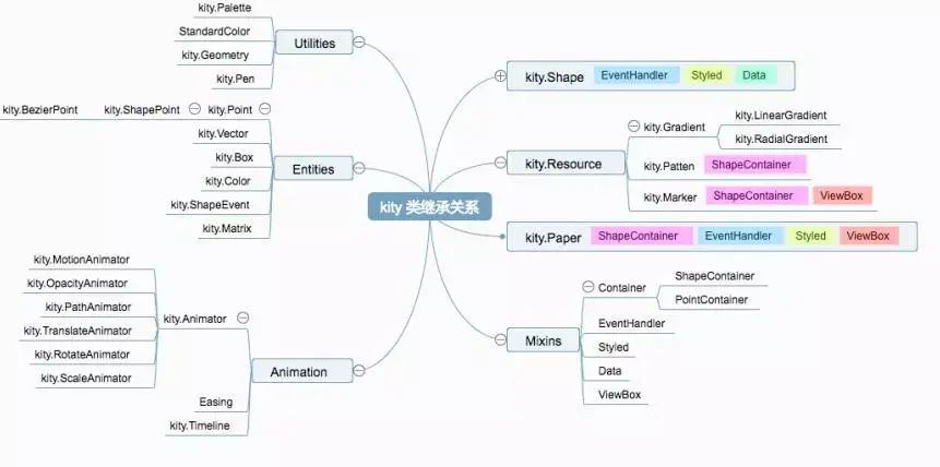 Kity是一款矢量图形库,它的最底层特性是面向对象支持。众所周知JavaScript是弱类型语言,要想用它完成工程化的产出,就需要面向对象的支持。因此我们基于ES5构建了一套面向对象语言的实现,包括定义类、扩展类、继承以及混合。下图就是Kity类的继承关系。