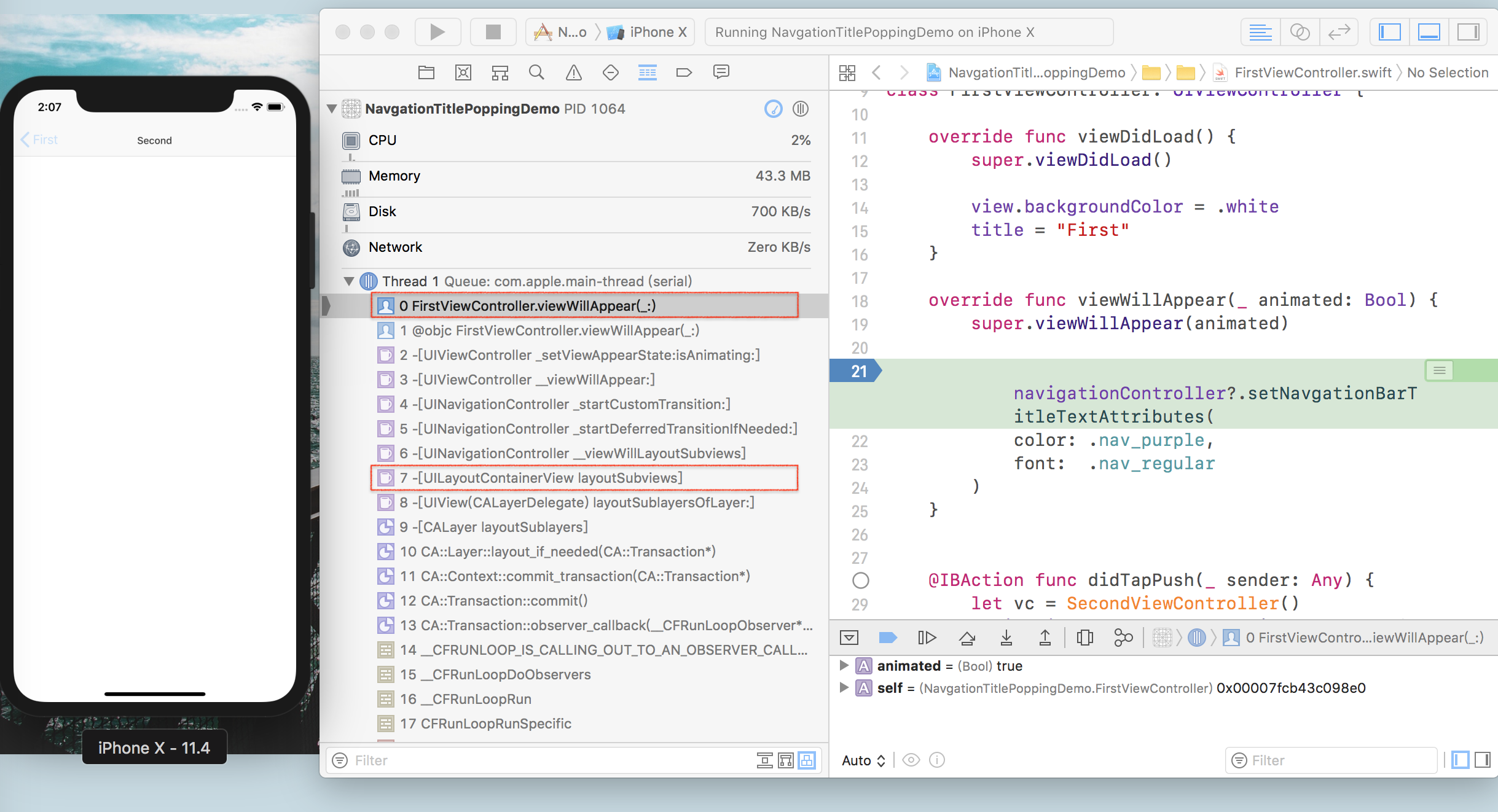 比较简单的处理方法是在SecondViewController中重写willMove(:)方法,在这里将titleAttribute赋值回去,但这样的方式不够彻底,它显然不能处理两种或两种以上的状态变化。 更为稳妥的的方法是重写自定义UINavigationController中的popViewController(:)方法。