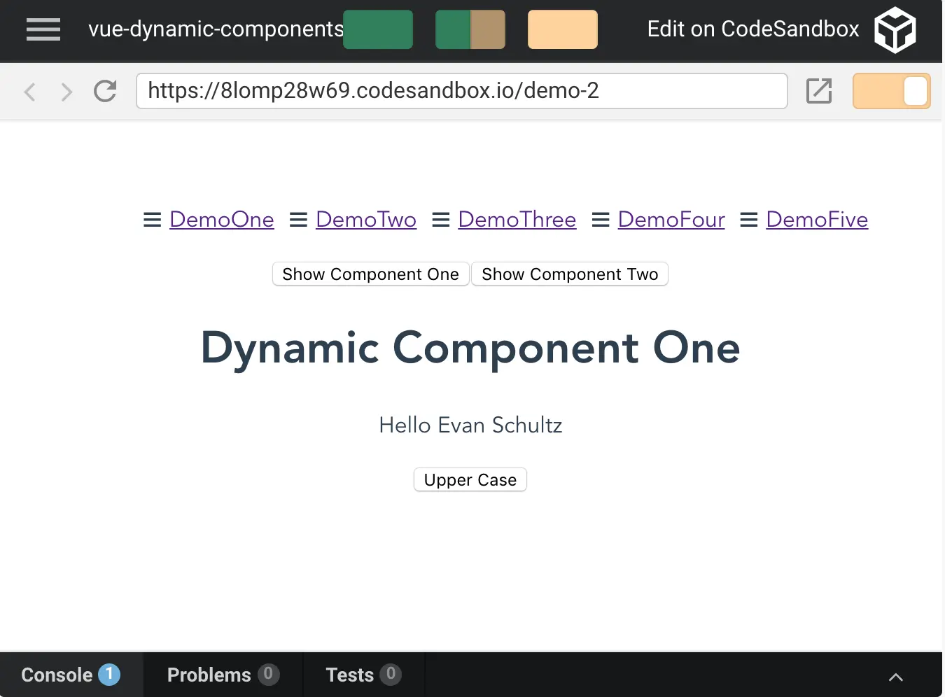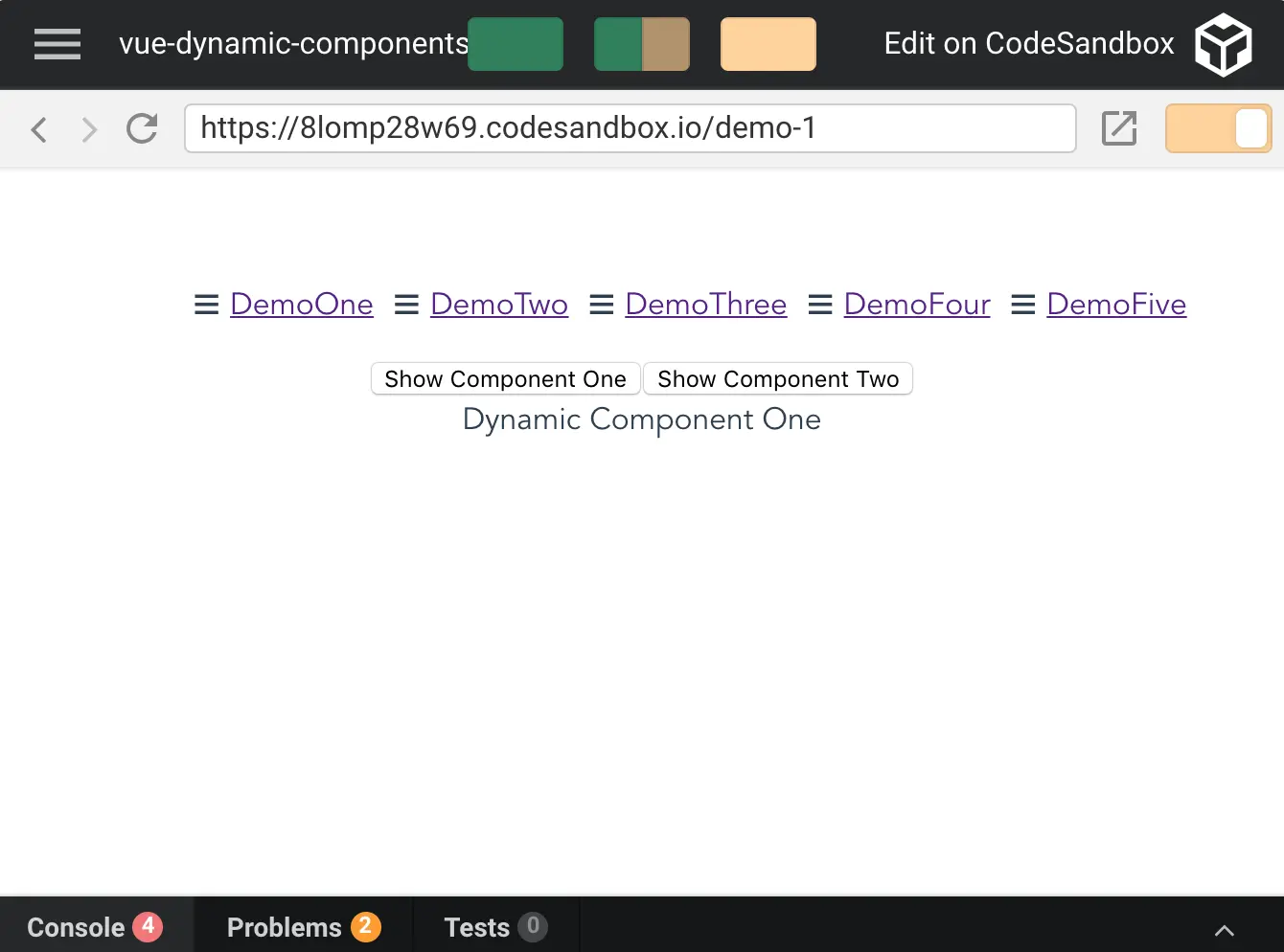 注意:showWhich data 属性的值是字符串DynamicOne-这是在组件的components对象中创建的属性名。