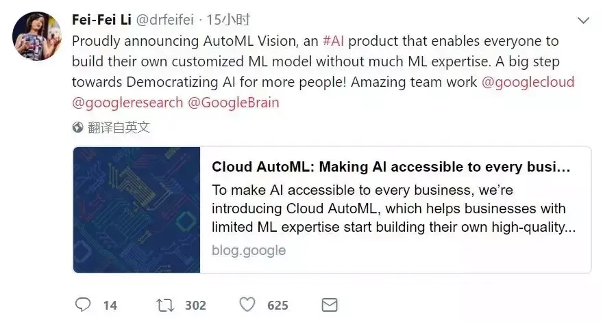 今年 1 月,谷歌发布了 Cloud AutoML。北京时间 1 月 18 日凌晨时分,李飞飞连发三条推特,发布了谷歌最新 AI 产品——Cloud AutoML Vision,“无需精通机器学习,每个人都能用这款 AI 产品定制机器学习模型。”