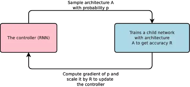 在谷歌内部被称为 Auto ML 的方法中,一个控制器神经网络可以提出一个“子”模型架构,然后可以在特定任务中对其进行训练和评估质量。之后,这种反馈被用来通知控制器如何改进其下一轮提案。经过数千次的重复,新的体系结构生成了。最终,控制器学习为空间区域分配高可能性,以在保持出来的验证数据集上实现更高的准确性,并且对建筑空间区域得分较低的区域的可能性低。以下是这一过程的样子: