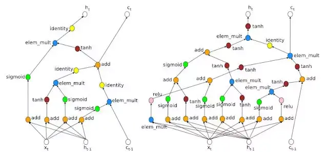 那么,它会产生什么样的神经网络?举一个例子:经过训练的经常性架构可以预测 Penn Treebank 数据集中的下一个单词。这里左边是由专家设计的神经网络。右边是上述方法创建的经常性架构:
