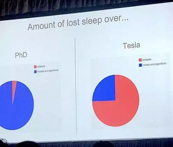 Andrej Karpathy 在 Train AI 演讲当中展示的这张幻灯片,可谓深得我心!它完美地体现了深度学习研究与实际生产之间的差异。学术论文几乎全部集中在新的改进模型身上,而数据集则通常选自一小部分公开归档。但在另一方面,我接触过的每一位实际用户都在努力将深度学习纳入实际应用程序当中,并把大部分时间投入到处理训练数据身上。
