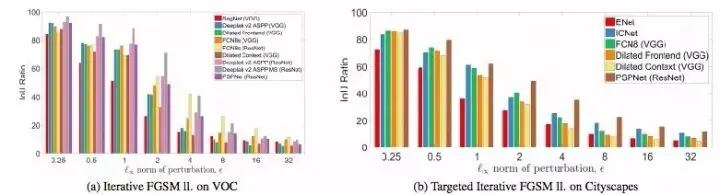 图 2:(a)在 Pascal VOC 数据集上的无目标攻击中,CRF-RNN 的鲁棒性显著优于 FCN8s。(b)CRF-RNN 对来自 FCN8 的黑箱攻击更加脆弱,因其「梯度掩蔽」会导致无效的白箱攻击。(c)此外,CRF 对于目标攻击并不「掩盖」梯度,它的鲁棒性和 FCN8s 不相上下。