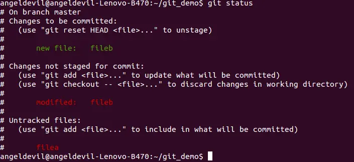 在上图中我们可以很清楚地看到,filea未跟踪,fileb已被暂存(changes to be committed),但是怎么还有一个fileb是modified但unstaged呢?这是因为当我们暂存一从此文件时,暂存的是那一文件当时的版本,当暂存后再次修改了这个文件后就会提示这个文件暂存后的修改是未被暂存的。