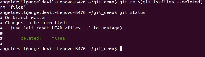 如果我们之前不是通过"git rm"删除了很多文件呢?比如说通过patch或者通过GUI,如果这些文件命名没有规则,一个一个地执行"git rm"会搞死人的,这时可以用以下命令: