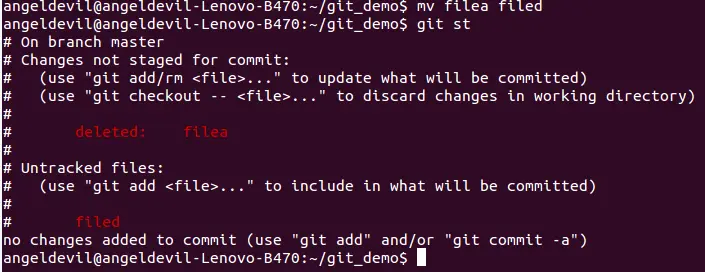 和移除文件一样,移动文件不可以通过GUI直接重命令或用"mv"命令,而是要用"git mv",不然同移除文件一样你会得到如下结果: