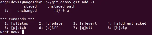 使用git add -i可以开启交互式暂存,如图所示,系统会列出一个功能菜单让选择将要执行的操作。