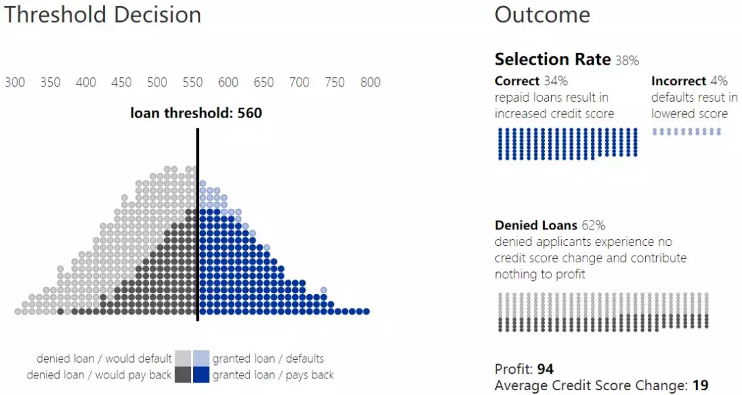 假设银行可以对每个群体选择不同的阈值,虽然这可能面临法律挑战,但为了预防由于固定阈值决策可能带来的差别结果,基于群体的阈值是无法避免的。