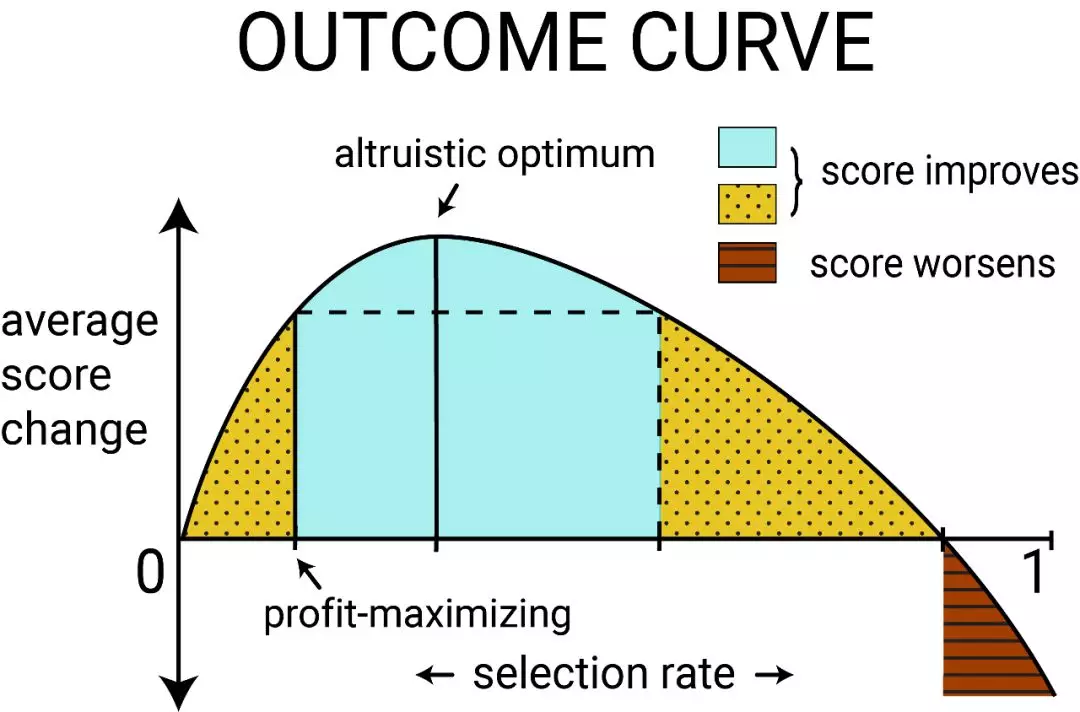 在阈值策略中,结果(outcome)被定义为某群体得分的变化期望,可以参数化为选择率的函数,称此函数为结果曲线(outcome curve)。当某群体的选择率发生变化时,其结果也会发生变化。这些总体人数级别上的结果会同时取决于偿还概率(由得分编码得到)、成本以及个体贷款决策的收益。