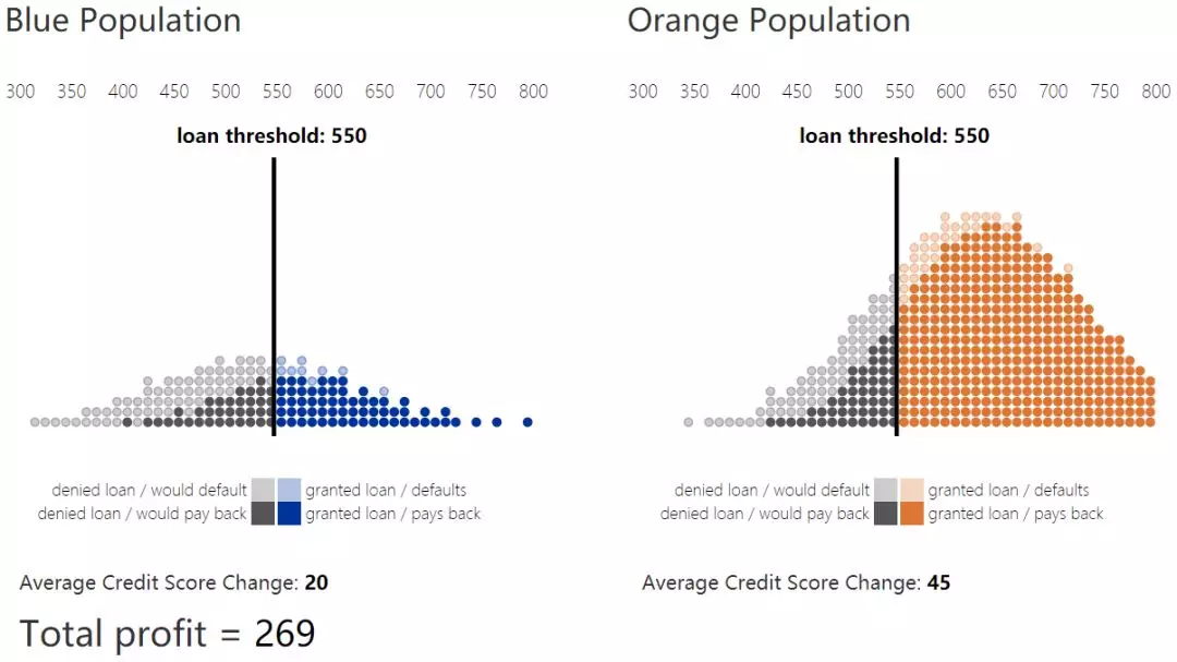 很自然的会出现问题:怎样的阈值选择可以在蓝群体的得分分布中得到期望改善。如上文所述,无约束的银行策略会最大化收益,并选取收支平衡、贷款有利可图的点。事实上,收益最大化阈值(信用得分为 580)在两个群体中是相同的。