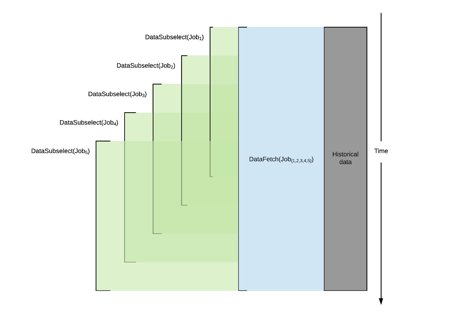 Figure 2: Having forecasting jobs that are responsible for the same time series at adjacent time ranges retrieve their own own requisite data results in serious redundancy, burdening the metrics system.