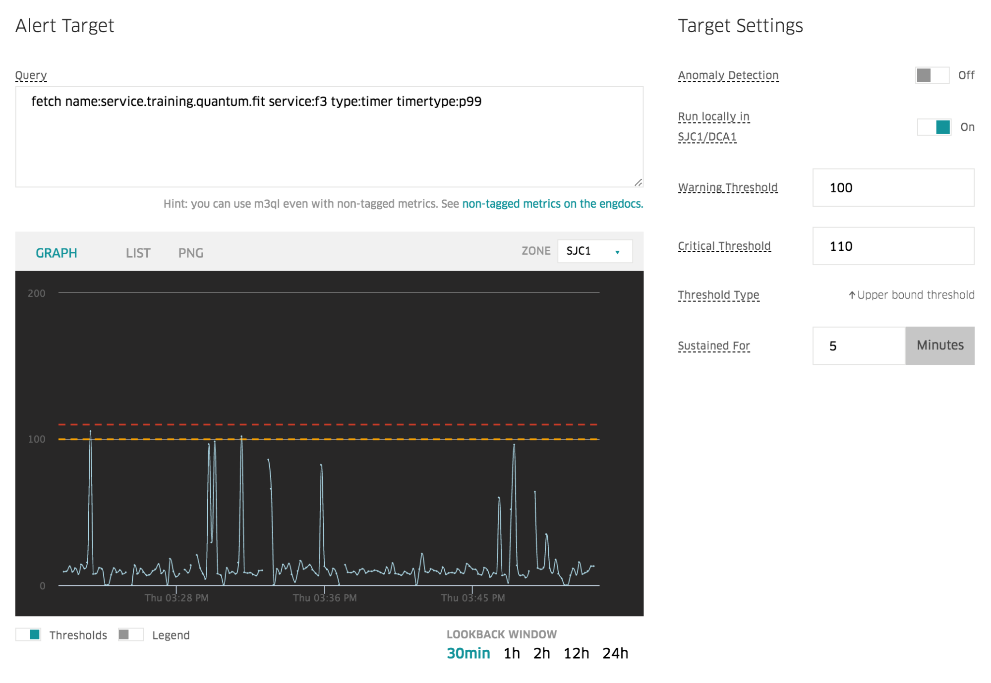 At its core, a uMonitor alert consists of a metric query, a set of alerting thresholds, and a set of one or more actions to execute in the event that the monitored metric exceeds its corresponding thresholds. These actions can be thought of as hooks that, for example, might allow the alert in question to page the team responsible for that service with a push notification for extreme metric deviations, while only sending a non-intrusive email for relatively minor ones. On top of these baseline attributes, uMonitor also provides authors with a suite of robust configuration options that further bolster alerting behavior in more nuanced ways—for example, by alerting with respect to dynamic thresholds (as opposed to traditional static ones) via anomaly detection, or by suppressing alerts until a threshold violation has been sustained for a certain amount of time.