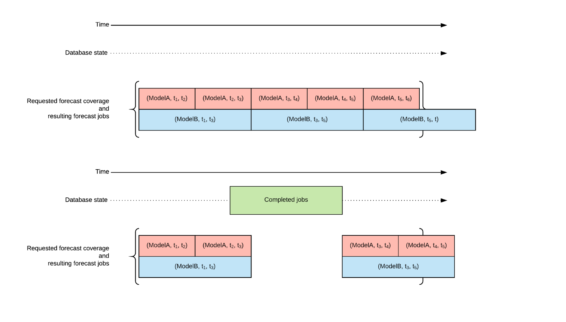Figure 3: By maintaining a persistent record of which forecasting jobs are either completed or in progress, F3 can infer what jobs are required in order to “fill in the gaps.” Overlaps between jobs for any given point in time, as shown here, are tolerable.