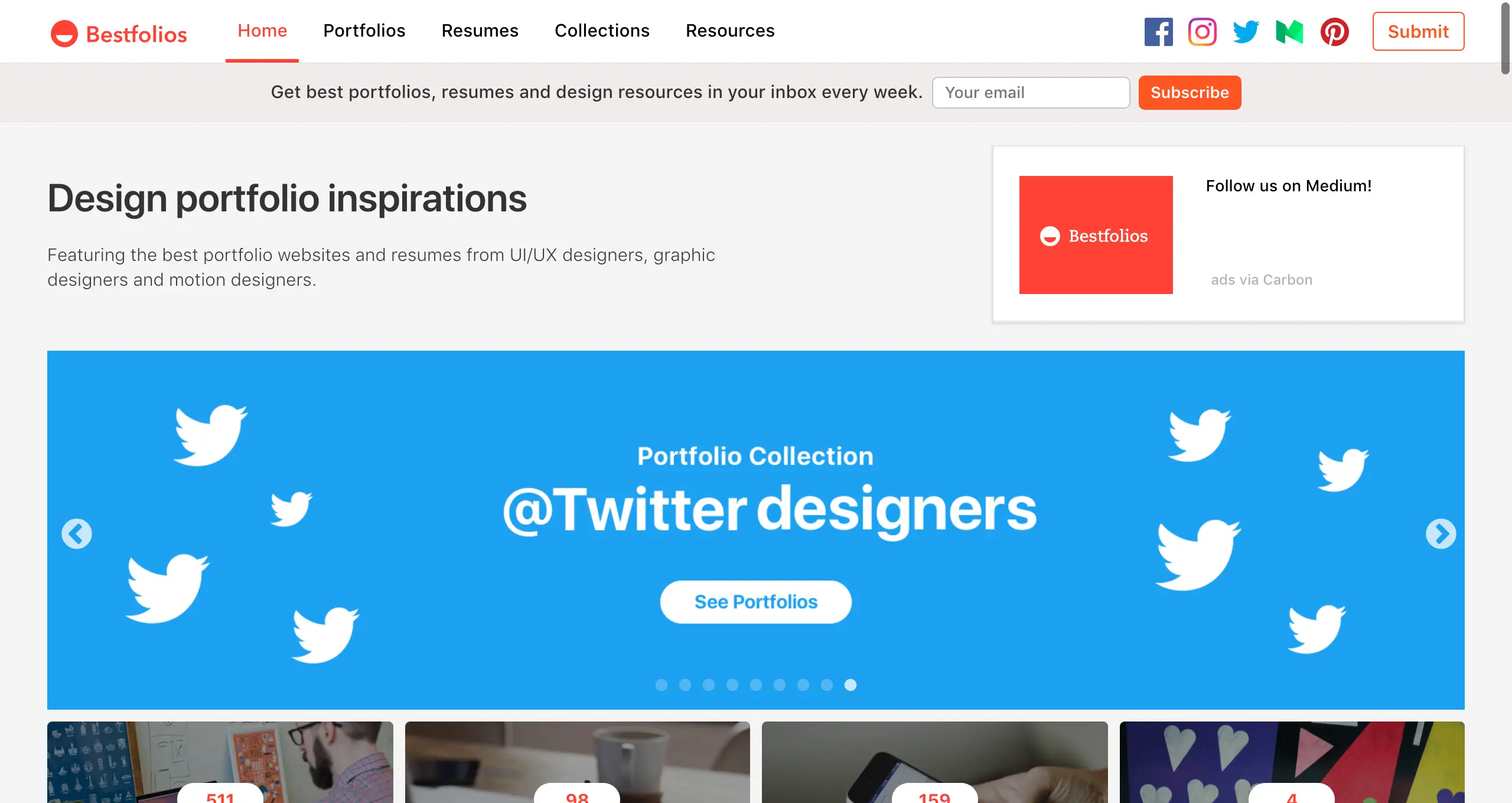 网址:bestfolios.com/homeBestfolios 是一个收集互联网优质UI、UX设计作品的聚合站点,帮助网页设计师们找到最好的设计组合,如果在设计项目的时候没有好的灵感,不妨打开该网站浏览一番,找找创作灵感。