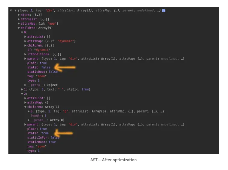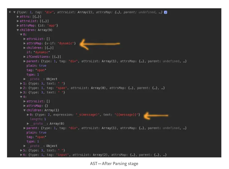 模板首先会被编译器编译成AST树, AST包含每个标签的信息类似:attribute, parent, children, tags, etc。自定义标签比如 v-for, v-if, v-once的会以key-value pair存在AST上。V-if指令经过编译将会推入attrsMap如 { v-if: "dynamic" }