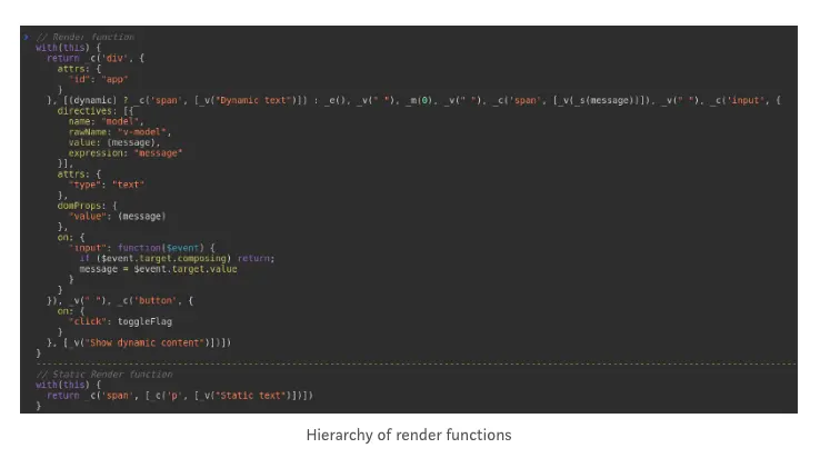 根据静态表示,将函数分为简单渲染函数和静态渲染函数。最后渲染函数将被用于创建VNode当触发真正渲染进程。