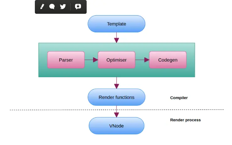Vue编译器读取一个组件的template,将会经过如下阶段:parsing, optimizing, codegen, render function, VNode。 最后生成的VNode将会由虚拟DOM处理来创建一个真实Dom。