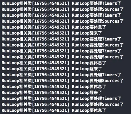 // 注意:打印方法一定要在RunLoop创建开始运行之前,如果在RunLoop跑起来之后打印,RunLoop先运行起来,已经在跑圈了就出不来了,进入死循环也就无法执行后面的操作了。