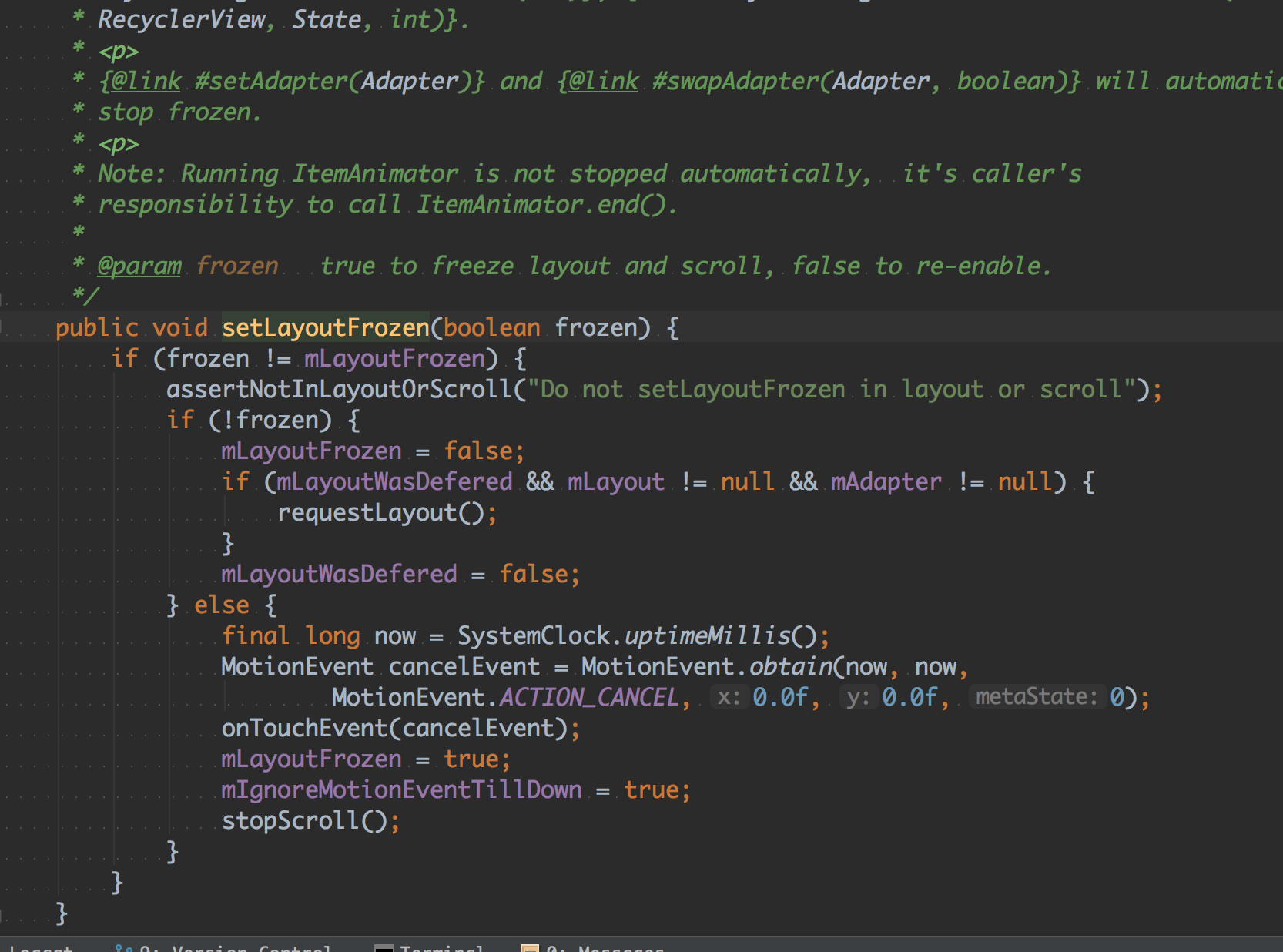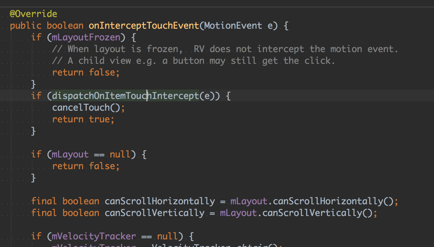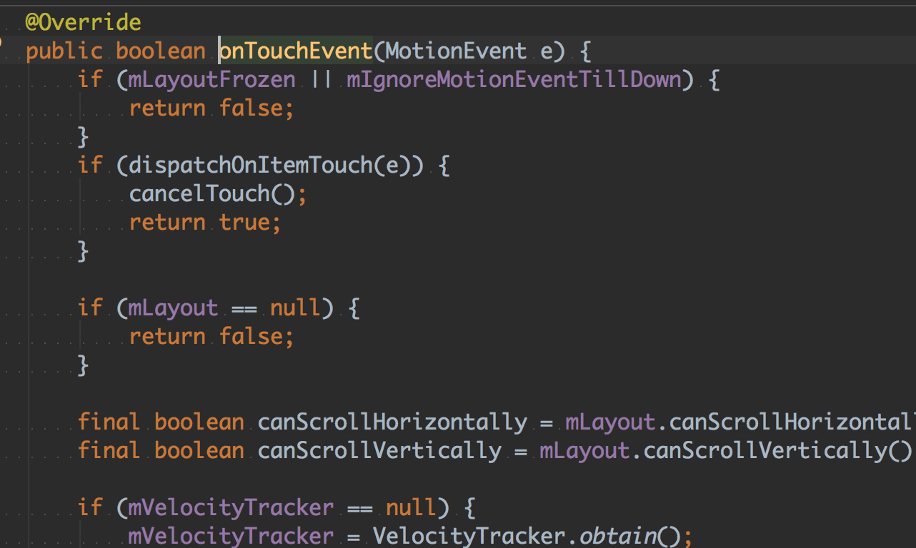 LinearLayout包裹RecyclerView,如果想给整个布局设置点击事件,发现当点击列表部分的时候点击事件不响应,猜测可能被recyclerview消耗了点击事件,所以只要让recycleview不拦截点击事件并且子view不消费这个事件,那么点击事件就会回传给父view也就是最外层的LinearLayout才处理这个事件,于是看了一下recycleview的源码: