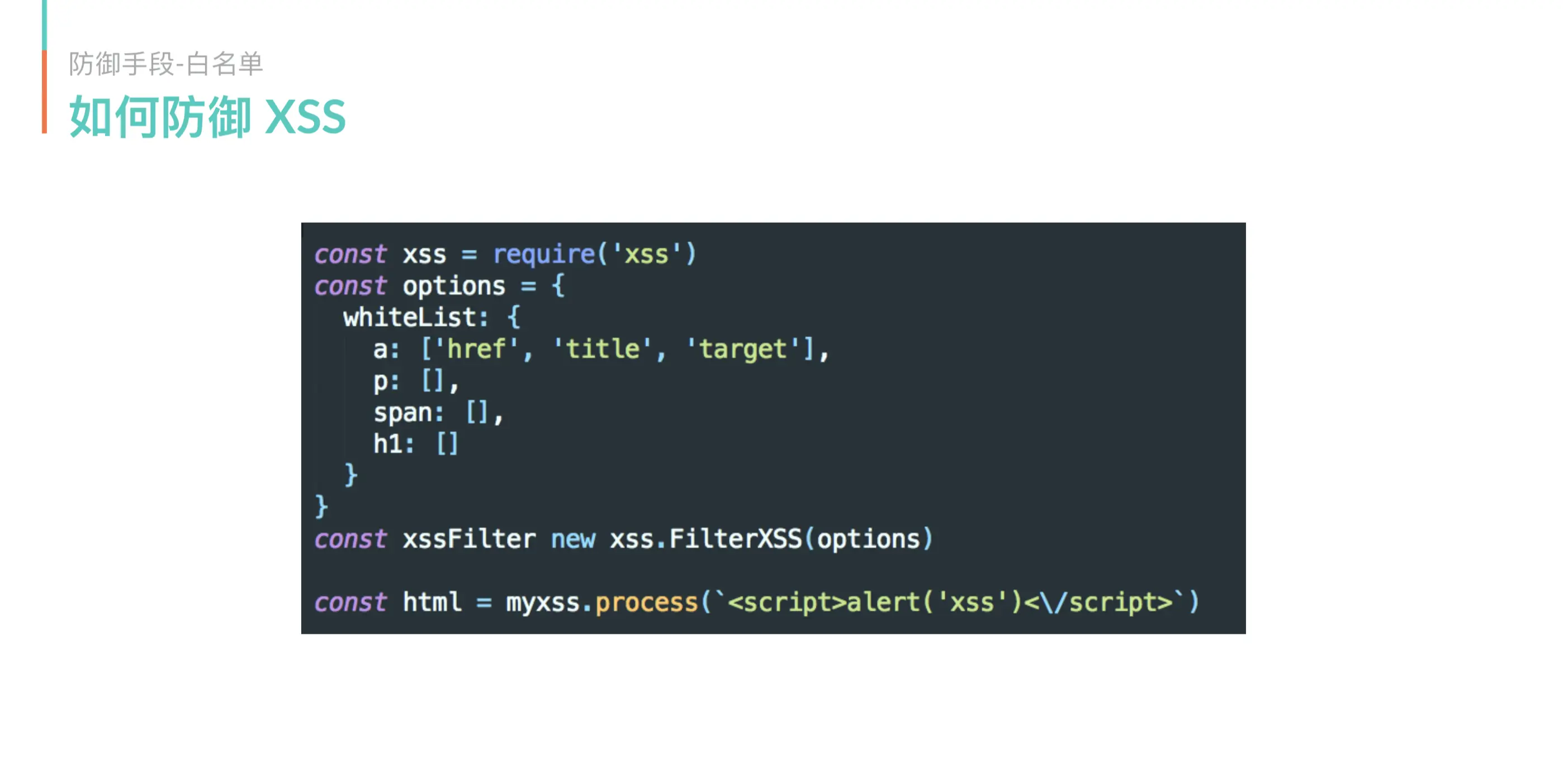 - 内容白名单,对外部动态内容的安全过滤使用白名单,而不是使用黑名单,通过白名单对指定的标签进行过滤选择。