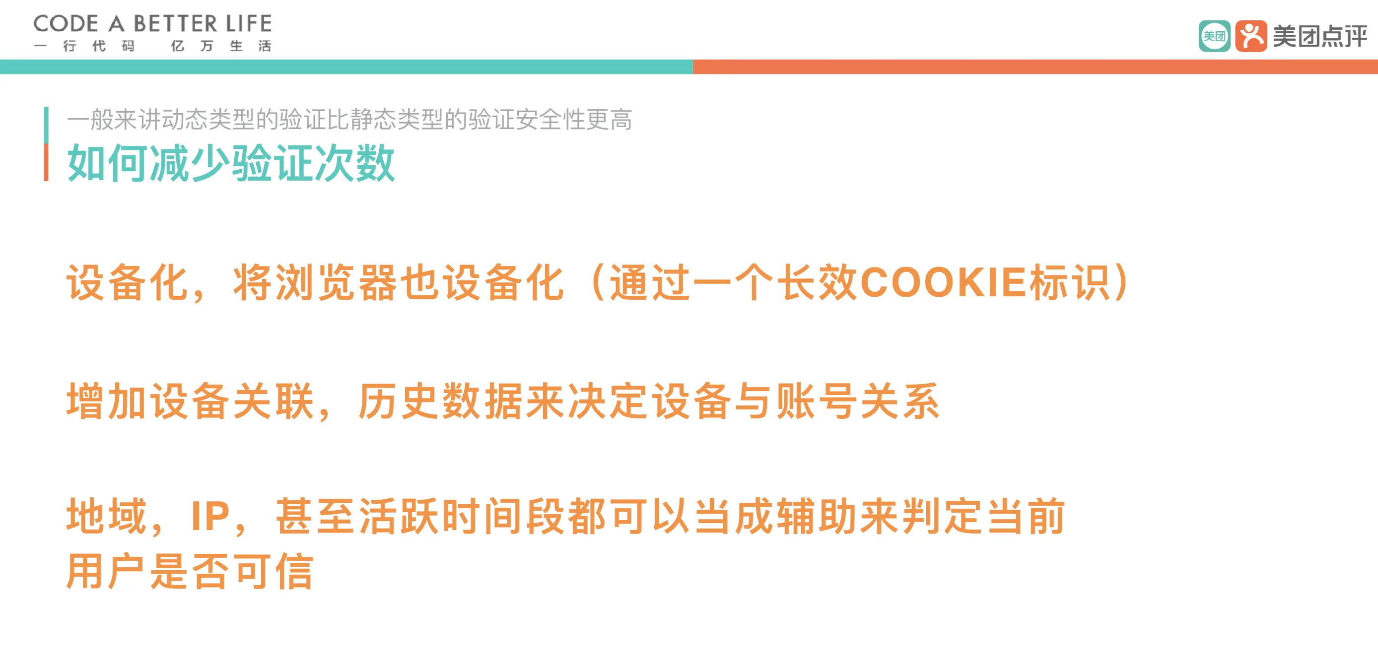 - 设备化,将浏览器也设备化(通过⼀一个⻓长效COOKIE标识) 增加设备关联,历史数据来决定设备与账号关系 地域,IP,甚⾄活跃时间段都可以当成辅助来判定当前用户是否可信。