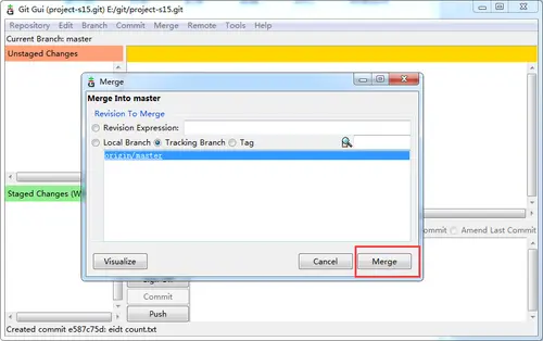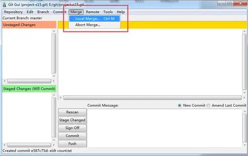 菜单->Merge->Local Merge,在Merge弹窗中选择Merge按钮,成功后会有Success弹窗出现。