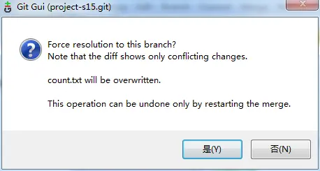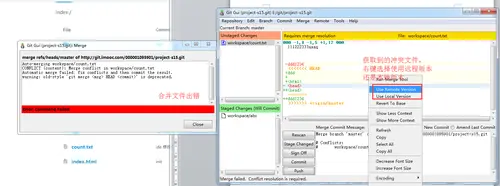 6、 如果合并之后检测到文件有冲突,是会提示Command Failed失败的,并且Git Gui是会获取到冲突文件,对于冲突文件的解决,可以右键选择使用远程版本还是本地版本,并且本地已经被打开的话,是会提示是否overwritten.按照此方法挨个解决下冲突文件即可。