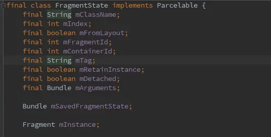 这里不知道你是否会困惑FragmentManager究竟为我们保存了Fragment的哪些状态数据?这些要被保存的信息保存在FragmentState类中(至于为什么是这个类,不是本文的重点),我们来看一下这个类的字段: