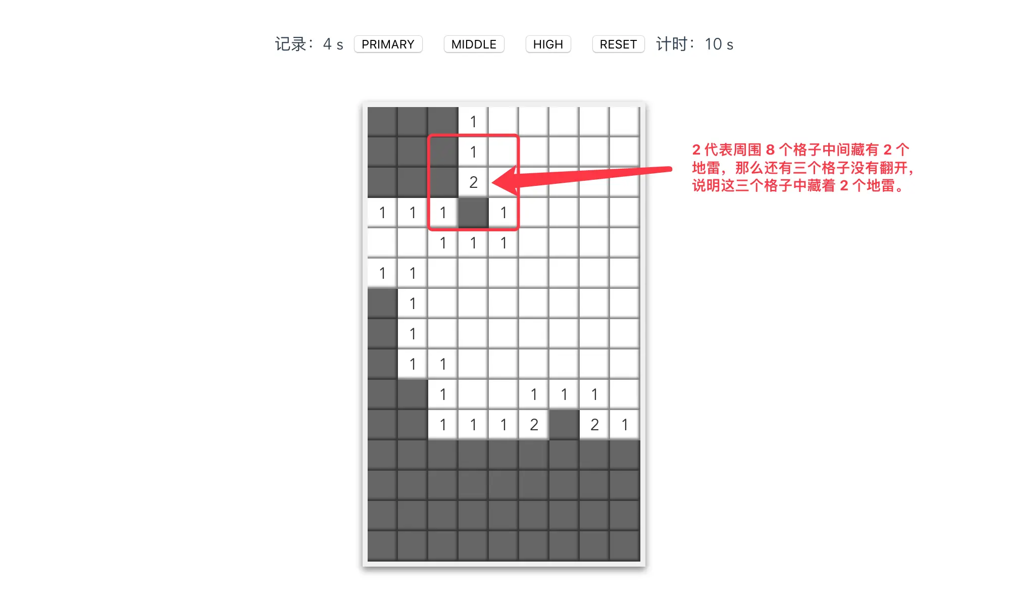 当然,还是有点技巧的:格子数字代表周围一圈 8 个格子里面藏着多少个雷。