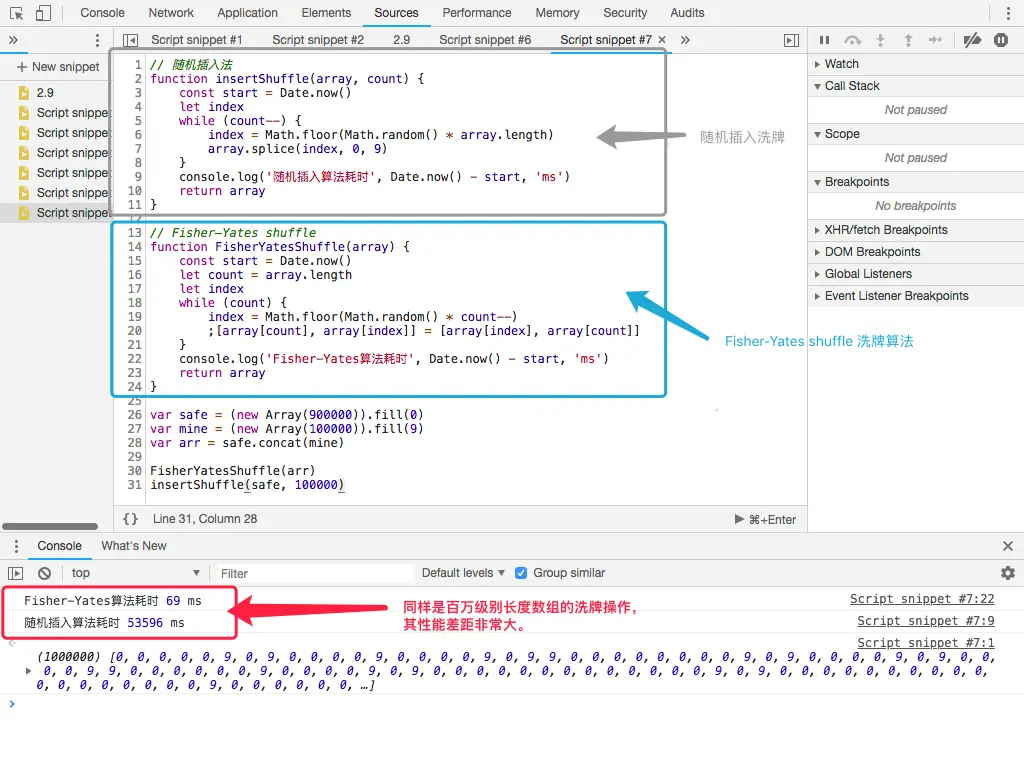 图中对比明显可以看出: 百万长度的数组,在浏览器环境下 Fisher-Yates 洗牌算法稳定在 70 ms 左右;而同样是 O(n) 时间复杂度的插入算法,在处理同样长度的数组时,性能落后非常多!