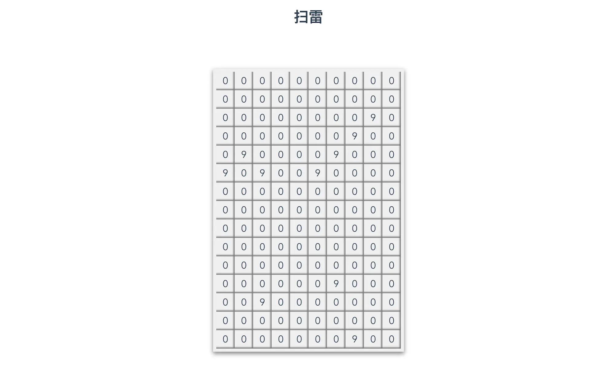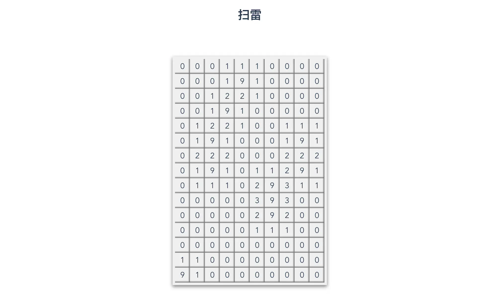 到此为止,我们终于生成个一个扫雷的初始雷区,包含了随机分布的地雷以及地雷周围正确的数字。