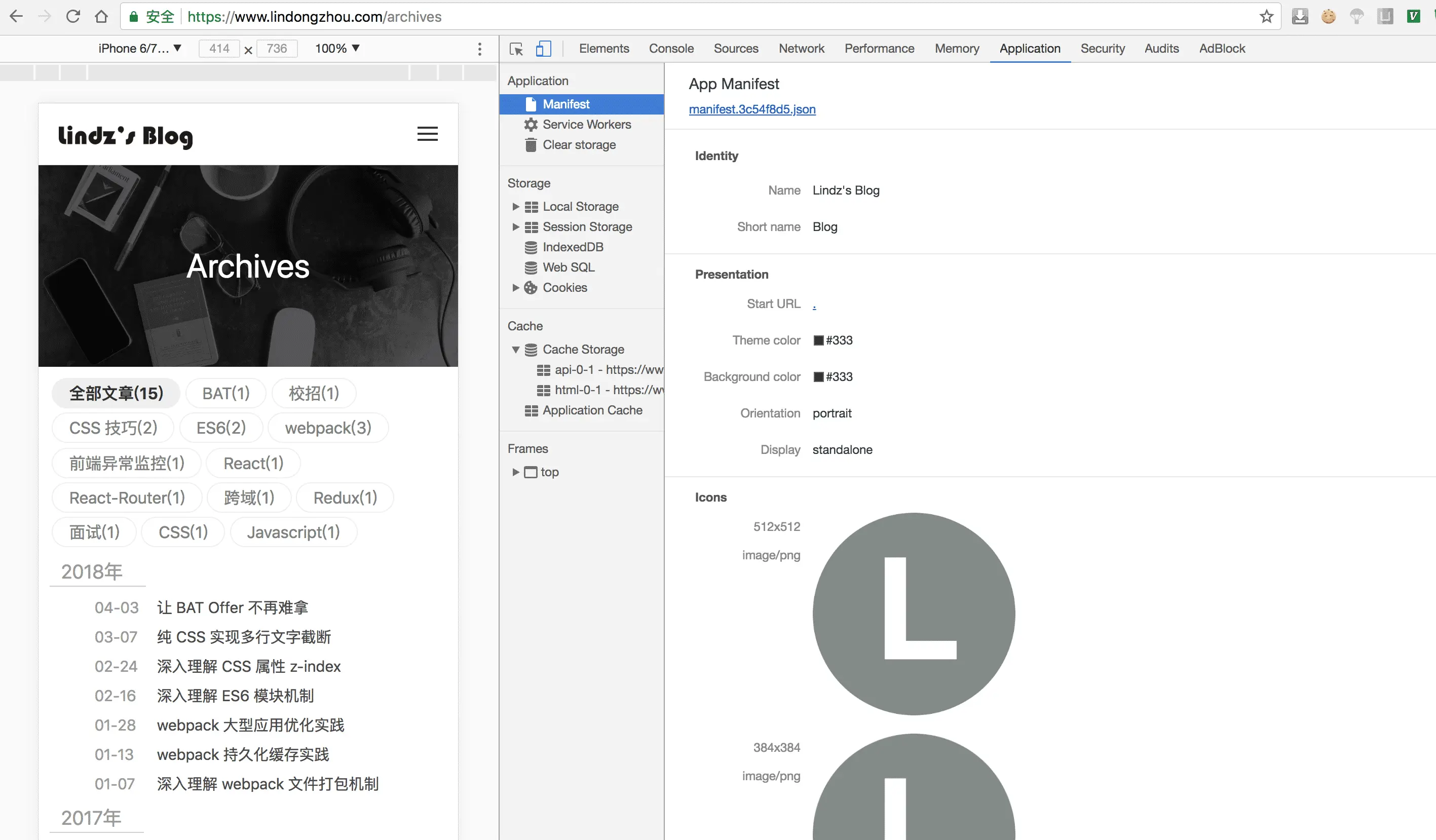 我的博客站点是通过 webpack 来构建前端代码的,所以我在社区里找到 webpack-pwa-manifest 插件用来生成 manifest.json。