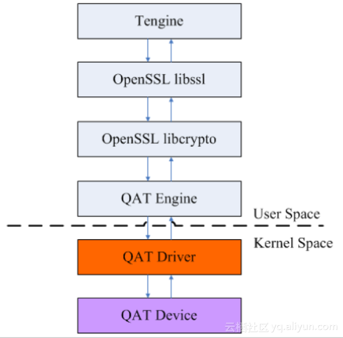 由三部分组成Tengine的ssl_async指令、OpenSSL + QAT Engine及QAT Driver。其中Tengine通过适配OpenSSL-1.1.0的异步接口,将私钥操作卸载至Intel提供的引擎(QAT engine)中,引擎通过 QAT驱动调用硬件完成非对称算法取回结果。