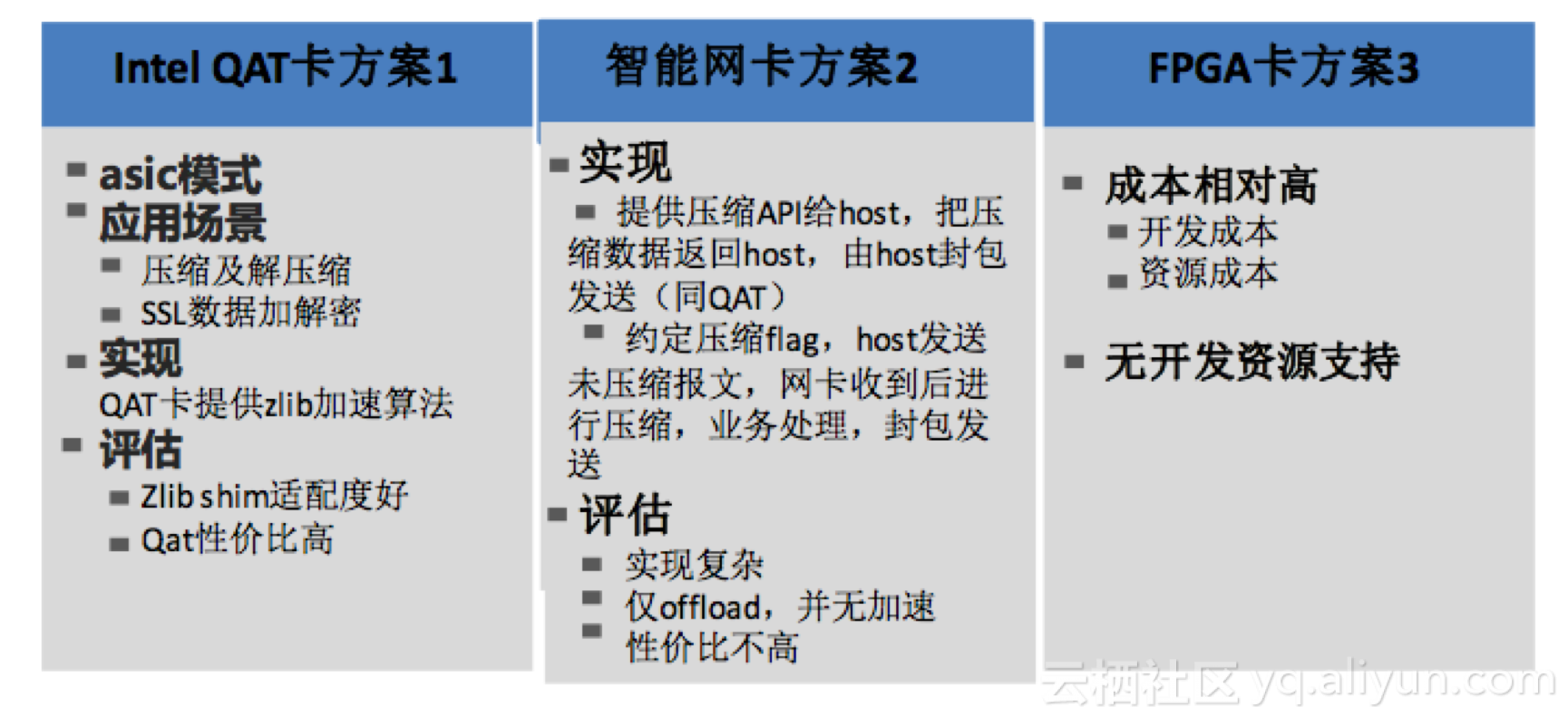 方案二智能网卡方案,需要把Tengine一部分业务逻辑抽取到网卡中做,其成本及风险高,而且只是对zlib进行软件卸载,相对于QAT并不具有加速作用。