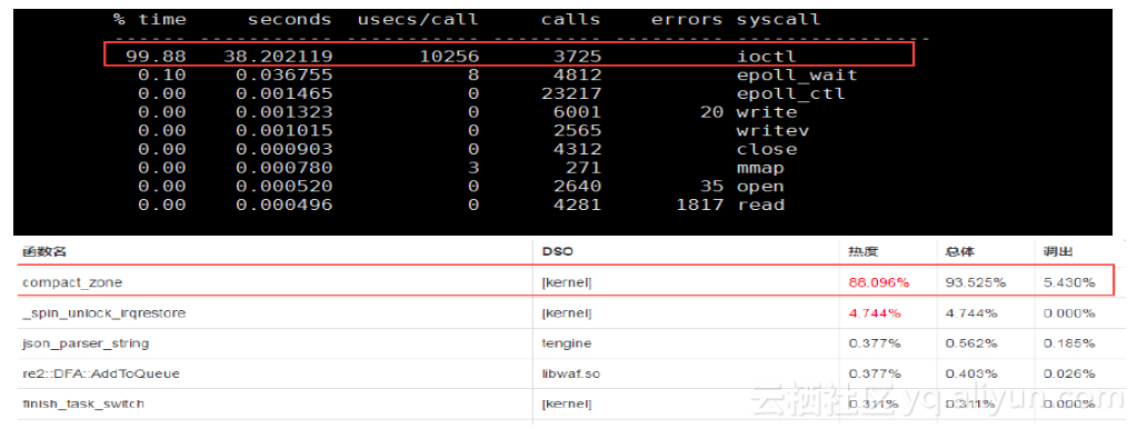 ioctl主要是做上层应用程序和底层通讯的,并且CPU消耗中90%以上都是消耗在内核态。因为最初的每个压缩请求都要送到硬件中去,buffer需要开辟连续的物理内存,系统跑久了,一旦遇到连续内存分配不成功的情况,就会需要ioctl去分配内存,出现频繁调用 compact_zone进行内碎片整理,其调用热的高达88.096%,如果分配失败了,就会触发内存去做碎片整理,所以就会出现sys态CPU持续上升的情况。