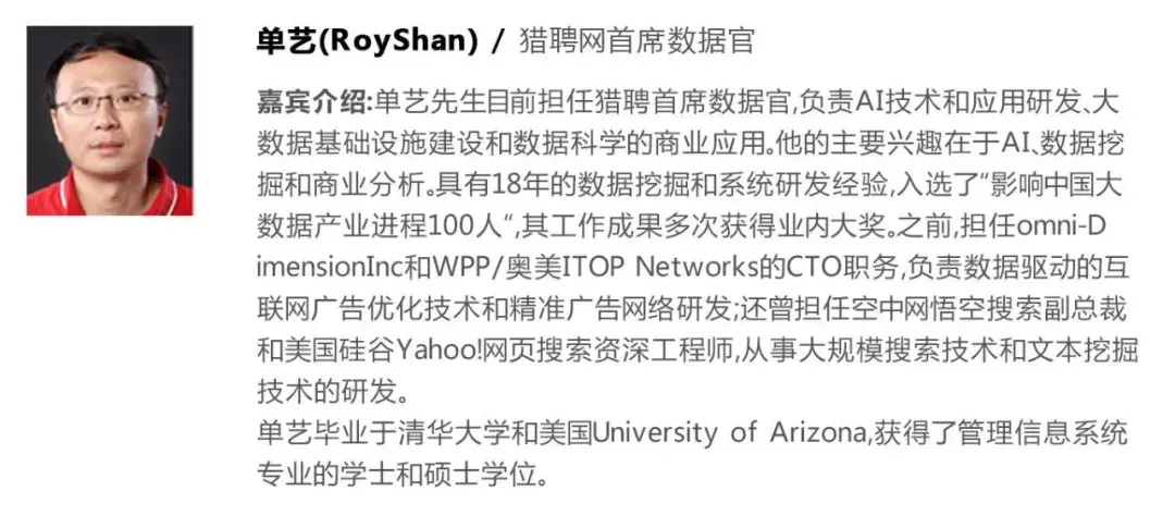 内容来源:2017 年 7 月 29 日,猎聘网首席数据官张博在“CDAS 2017 中国数据分析师行业峰会【大数据与人工智能】”进行《人工智能与人的职业发展》演讲分享。IT 大咖说(微信id:itdakashuo)作为独家视频合作方,经主办方和讲者审阅授权发布。