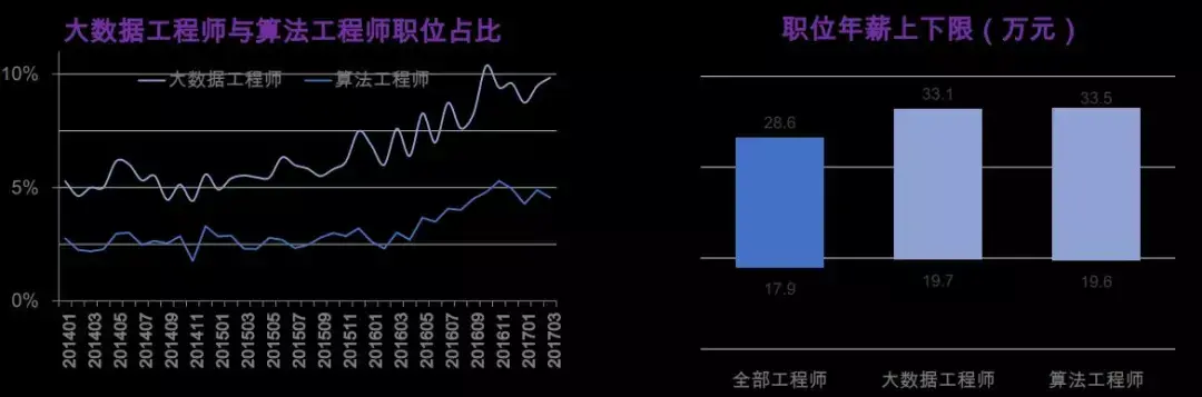上图为AI和大数据的职位占比趋势和薪资比较。可以看到AI和大数据人才的需求是呈现一个快速上升的阶段,薪资同样在大幅的增长。