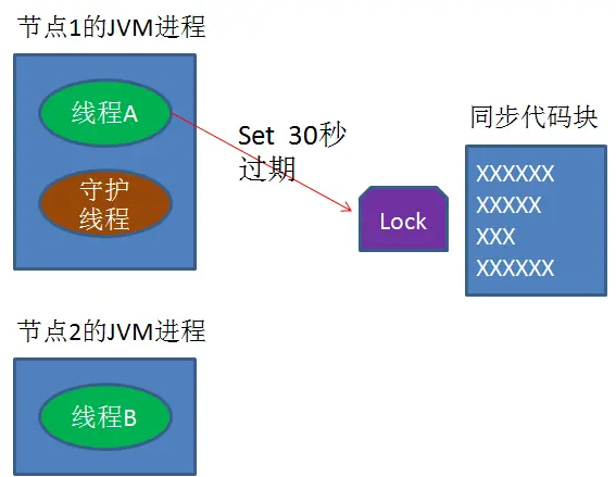另一种情况,如果节点1 忽然断电,由于线程A和守护线程在同一个进程,守护线程也会停下。这把锁到了超时的时候,没人给它续命,也就自动释放了。